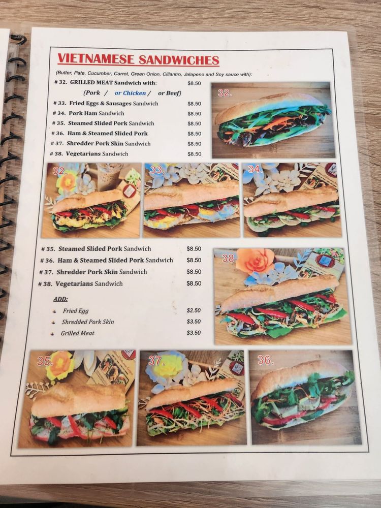 Come with: Pork Ham with butter, pate, lecture, cucumber, house pickles, onion, cilantro, house special sauce, hot chili, and sandwich.