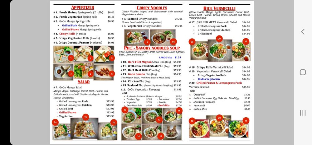 GOGO Pho is a Vietnamese soup restaurant located in Santa Clara, CA. Known for its savory noodle soups like Rare Filet Mignon Steak Pho, Chicken Pho, and Seafood Pho, this casual dining spot also offers crispy noodles and special dishes like Spicy Noodle Soup and Grilled Meat Sandwiches. Customers rave about the quality and freshness of the dishes, with one reviewer mentioning their love for the meatball and shrimp cake. The atmosphere is described as basic but charming, with fast service and generous portions. If you're craving authentic Vietnamese flavors, GOGO Pho is a must-visit spot for delicious and satisfying meals.
